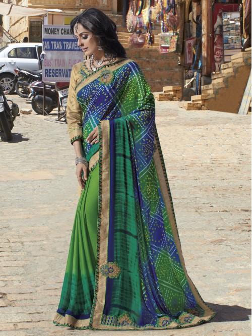 Green Georgette Lace Work Party wear Saree with unstitched Blouse material